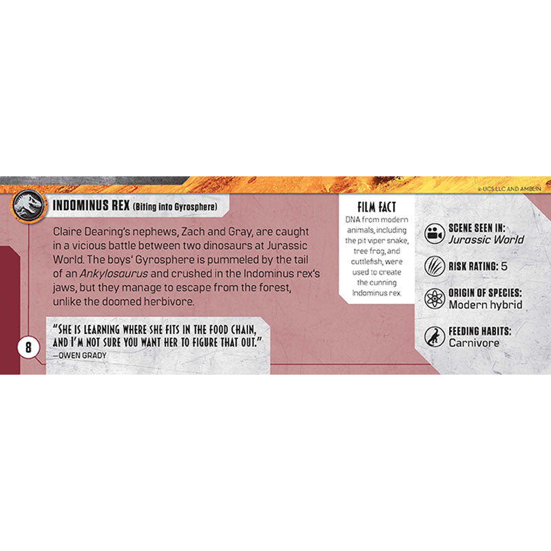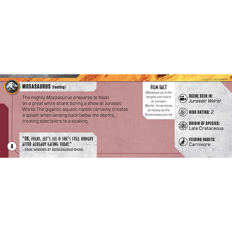 Each beautifully illustrated card is printed on the reverse with fun facts and stats, including a Fear Factor rating, dino diet and habitat info, and film facts from the franchise.