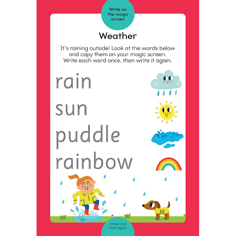 This book comes with a magic rainbow screen that young children can use over and over again. Practice writing the letters A through Z and simple words with fun activities and pictures to copy on every page. Kids 3+ will be excited to write the words using a stylus on a reusable screen, practicing letter recognition, handwriting, and simple reading. Want to start over? Simply press the magic button to erase the picture and begin again.
