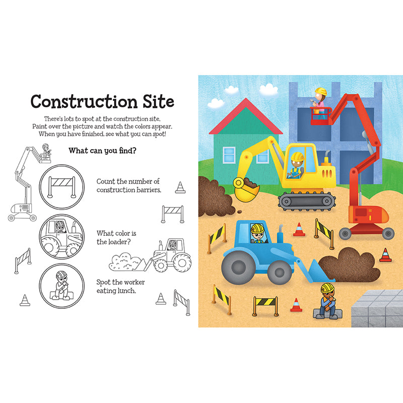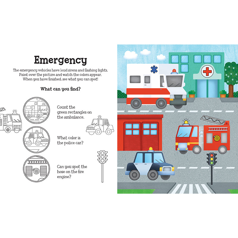 Like magic, things that go come to colorful life when kids paint with the included water-filled brush! As the water dries, the color disappears and the pages can be painted again and again. Ten scenes of race cars, fire trucks, construction vehicles, and more make for mess-free fun no matter where you are. Each page also includes search and find challenges that support literacy-building skills.